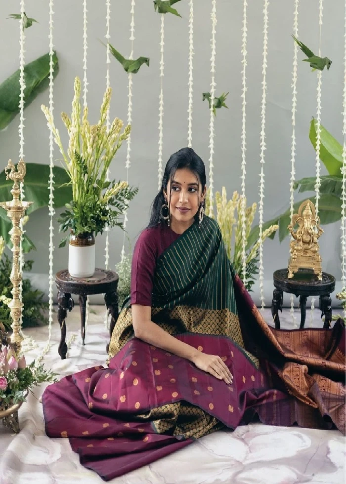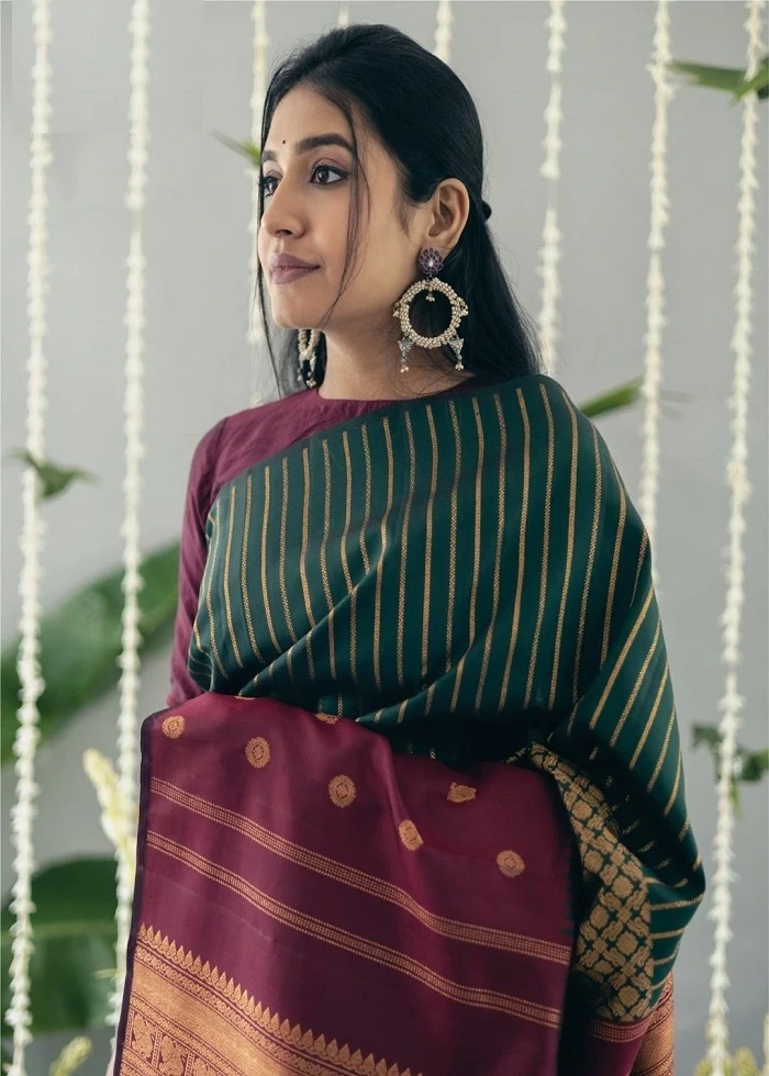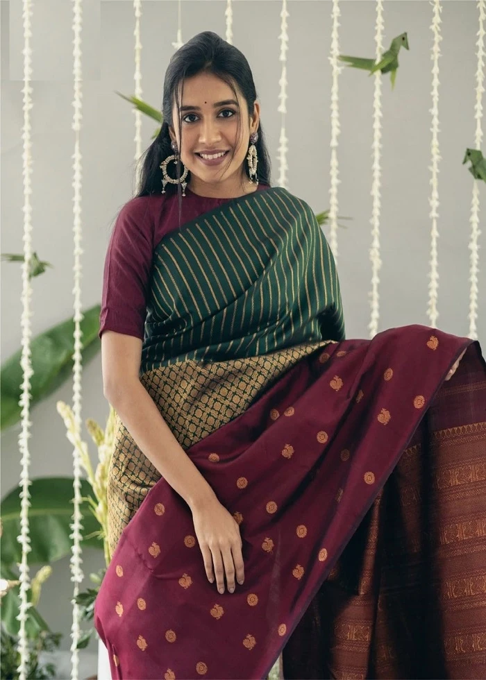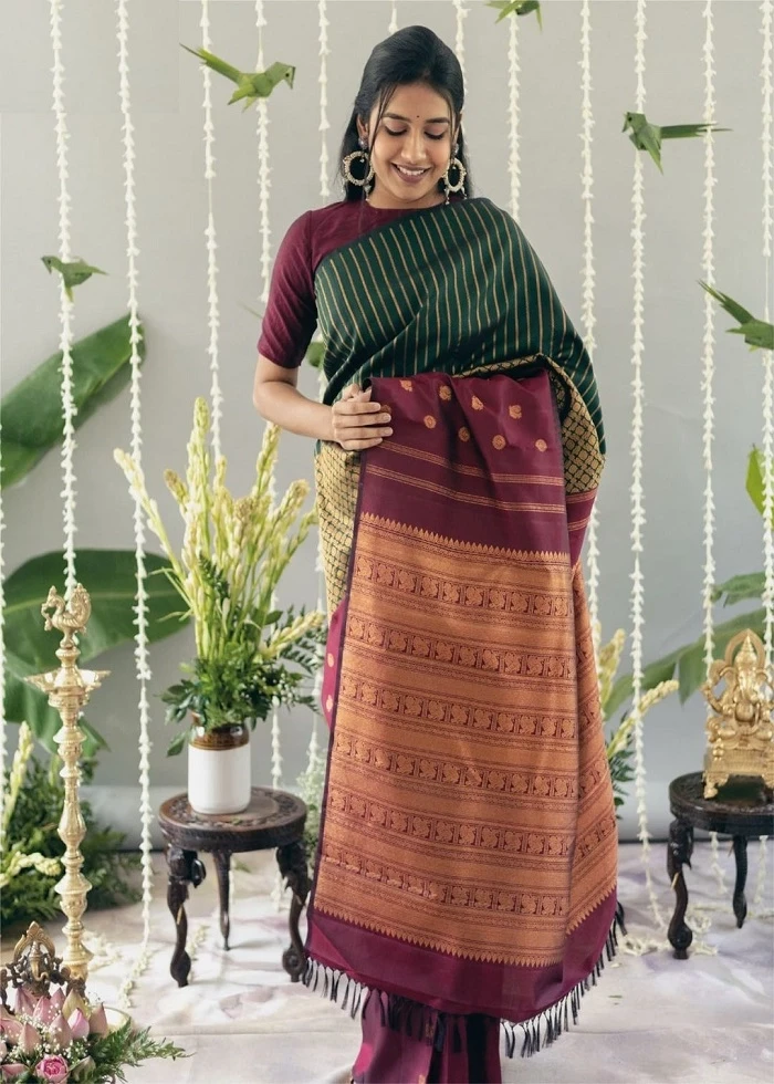 SAREE SPECIFICATIONS: ►Fabric: Soft Banarasi Silk ►Colour: Green and Wine ►Work Type: Jacquard