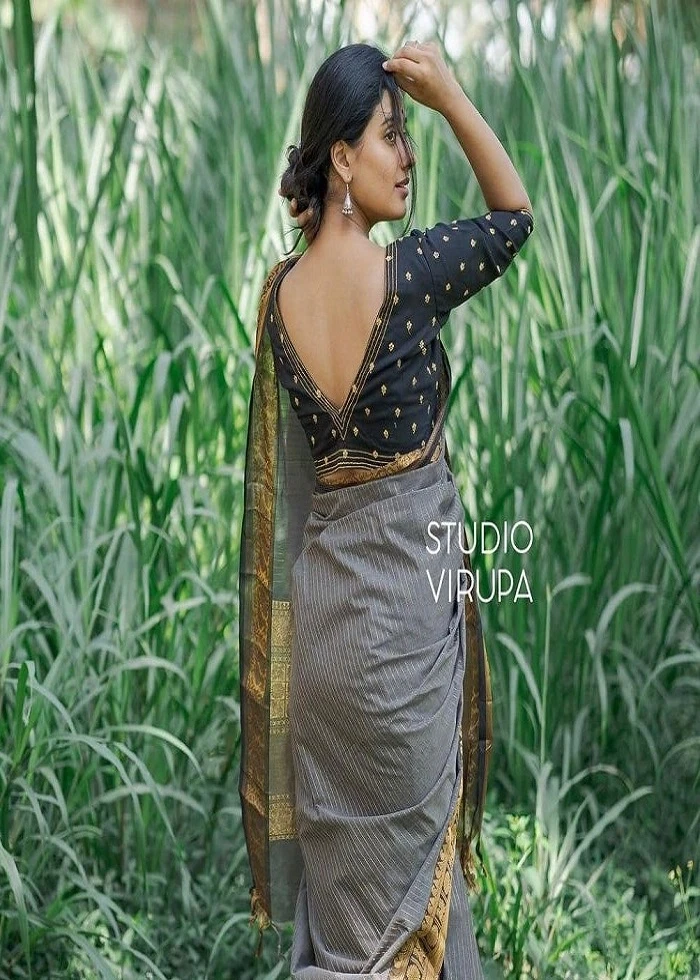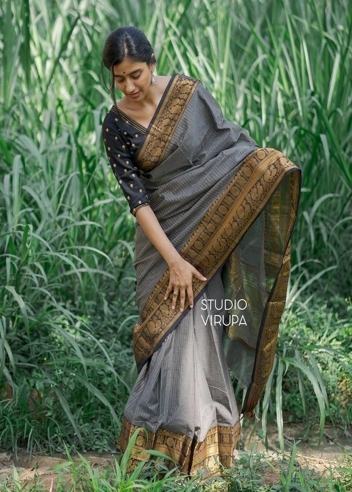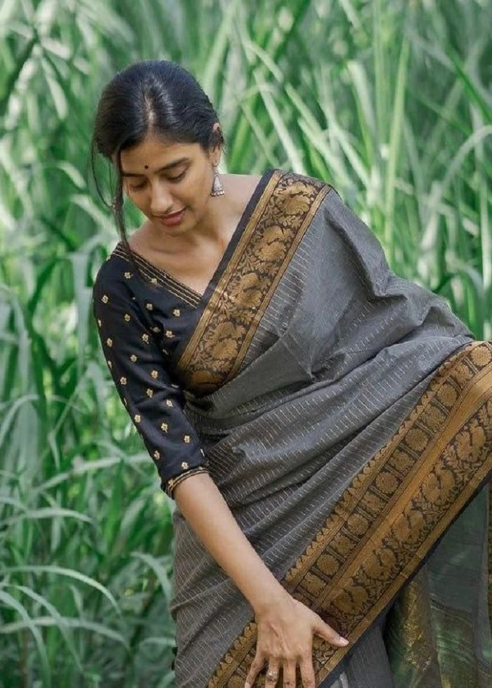 SAREE SPECIFICATIONS: ►Fabric: Soft Banarasi Silk ►Colour: Grey and Black ►Work Type: Jacquard
